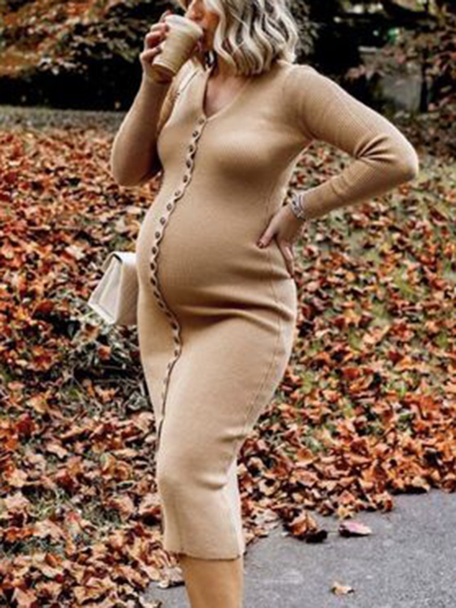 Maternity Casual Round Neck Long Sleeve Slim Button Knit Dress